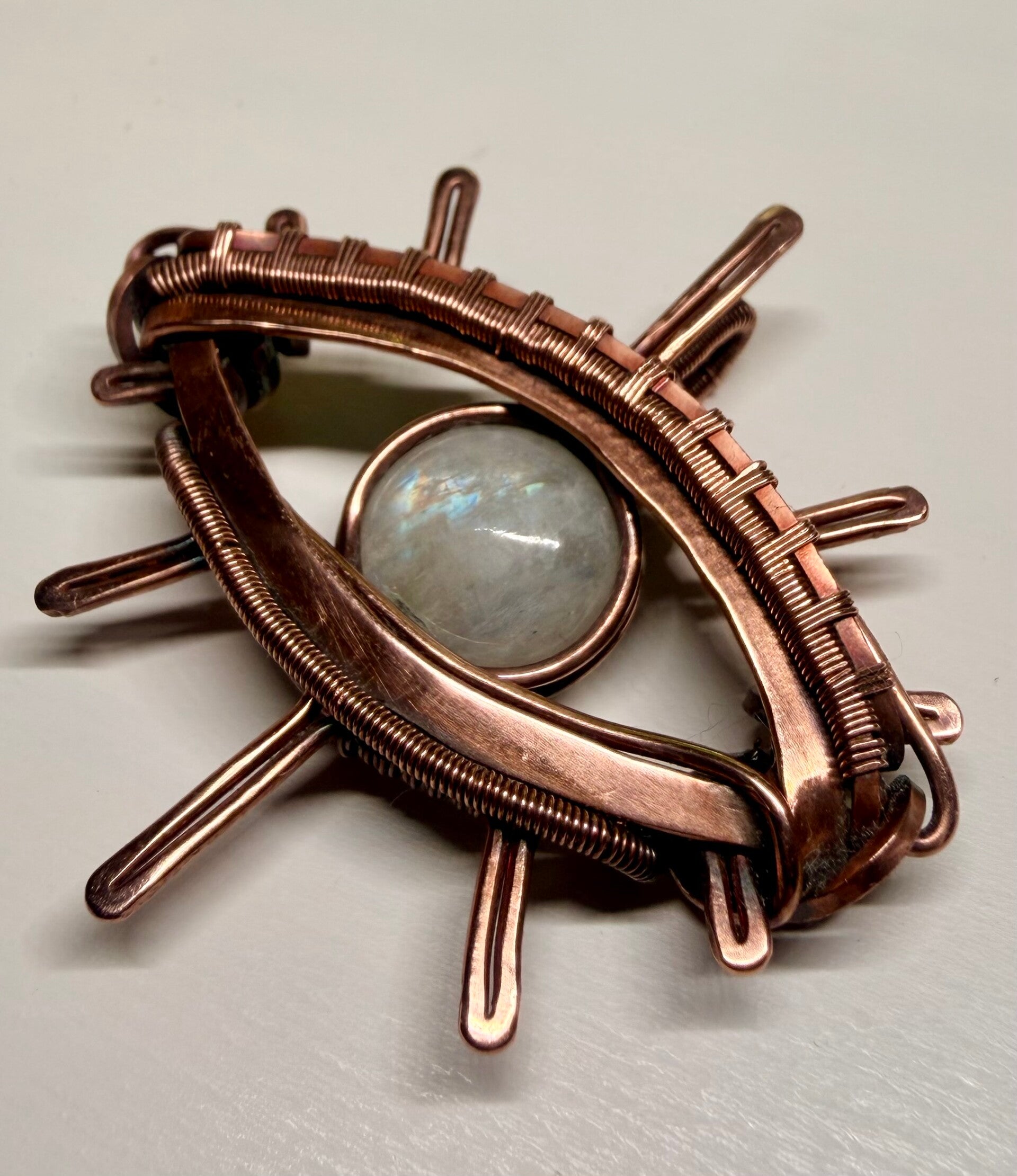 Once the main structure is complete, I refine the piece. I smooth edges, adjust the shape, and make sure the stone is securely held. I polish the copper so it shines while keeping the natural warmth of the metal. The final step is always a careful inspection — every detail matters.