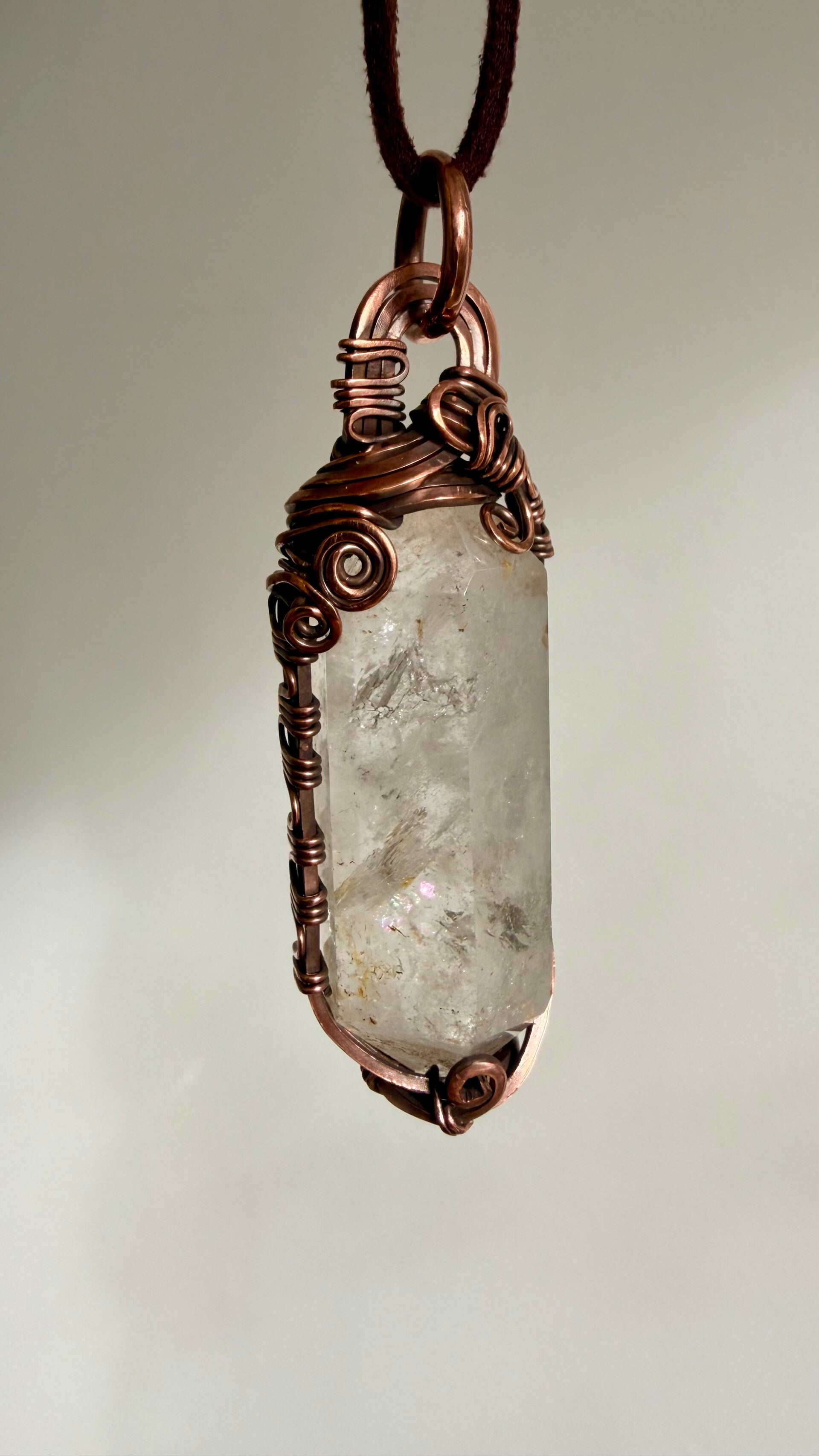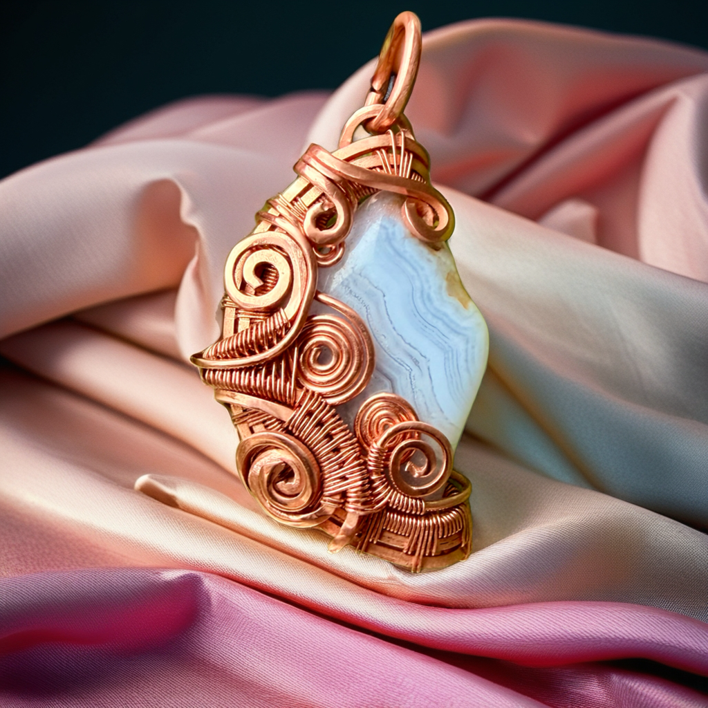 Next, I carefully choose the stones I will work with. Each stone has its own character — its color, shape, and energy. I let the stone guide me in deciding the best way to highlight its beauty. I pair the stones with high-quality copper wire, which is flexible yet strong enough to wrap and hold the stone securely.