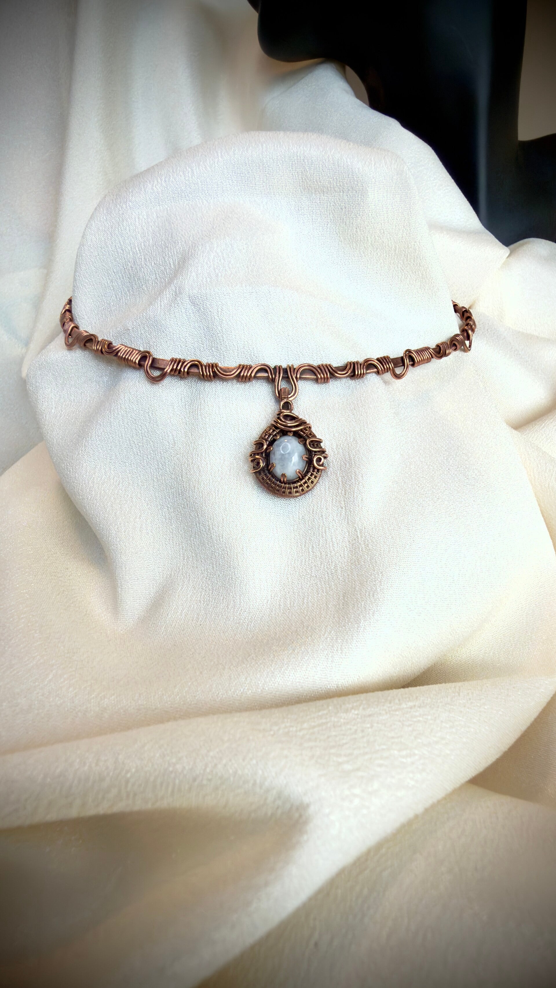 Embrace the magic of nature with this handcrafted moonstone choker, delicately wrapped in warm copper.